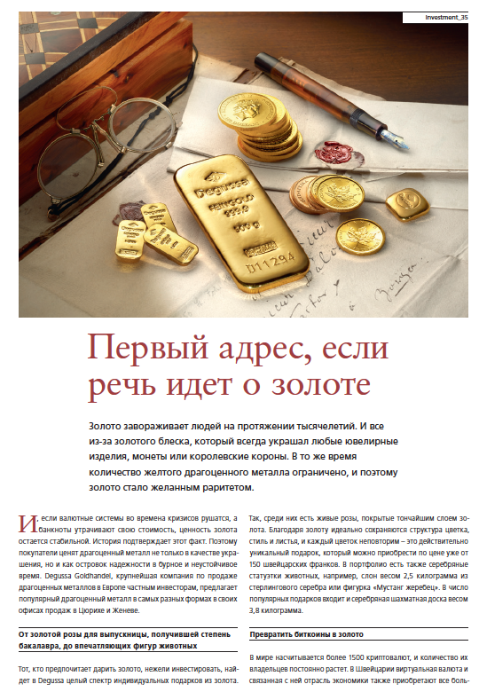 остается стабильной. История подтверждает этот факт. Поэтому покупатели ценят драгоценный металл не только в качестве украшения, но и как островок надежности в бурное и неустойчивое время. Degussa Goldhandel, крупнейшая компания по продаже драгоценных металлов в Европе частным инвесторам, предлагает популярный драгоценный металл в самых разных формах в своих офисах продаж в Цюрихе и Женеве.